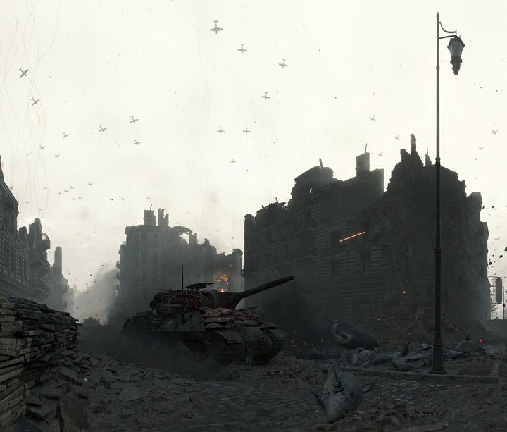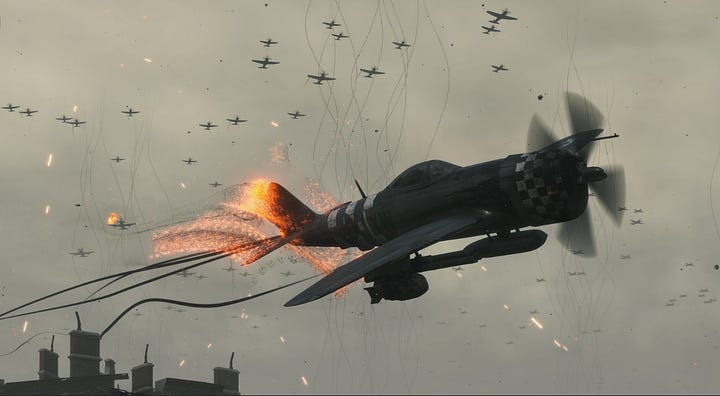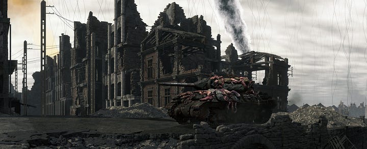 A phrase spoken twice by Clifford Unger, the archetypal figure of a soldier who embodies the dead ends, the bitterness, and the rage born from the discovery of the world’s betrayal. We encounter him primarily as a boss fight, across various battlefields: World War I, World War II, Vietnam... He himself never fought in any of those wars, yet he wanders as a ghost through them, always tethered to his platoon by cables-umbilical cords. War is treated as humanity’s greatest sin. A betrayal of ourselves, a kind of cancer. Every battle in history is connected to all the others across a vast beach of shame, where the only living thing are the tanks and the dead wander condemned to repeat the same futile violence in perpetuity. On the battlefields are also scattered the carcasses of whales, the most imposing of the mammals. Their image bespeaks sickness. The lesson? The obvious. All wars are the same. Equally futile, equally unjust, equally unnatural, equally wrong... again and again and again. The history of humanity is black tar, and our steps through it are agonizingly slow.