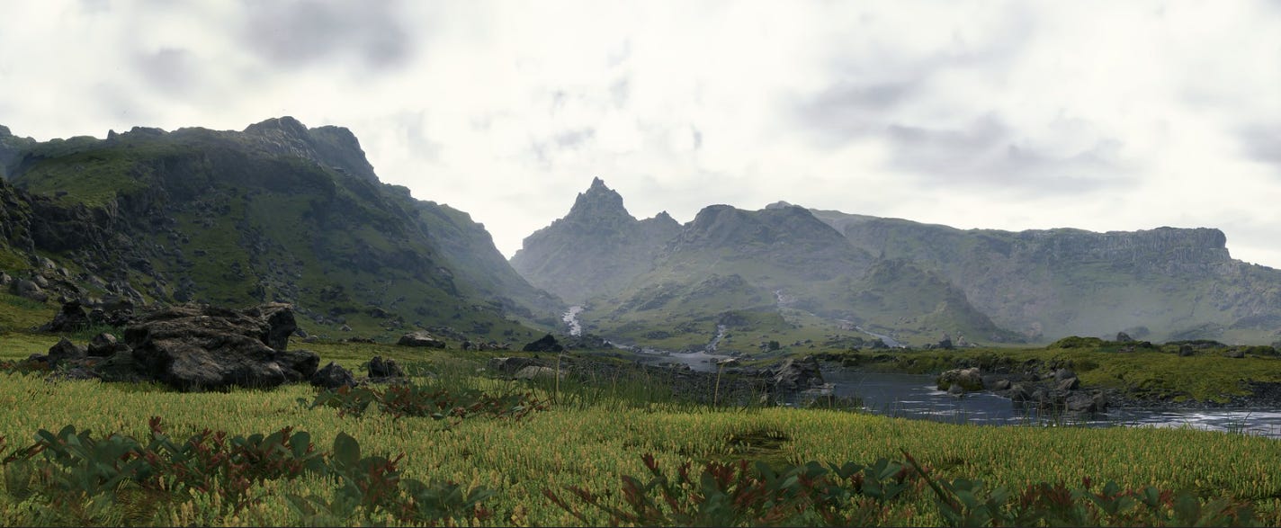 Against its initial pervasive pessimism, the game gradually turns its attention towards the value of connection, and becomes increasingly tender. The Death Stranding has brought dissolution; the prior civilization is regarded with nostalgia and awe. The beginning of Sam’s odyssey finds the player leaving behind the ridgeline of Capital Knot City, a metropolis that stands imposing and emblematic, yet empty... grey... like a giant carcass. It is the second giant carcass we encounter in the game’s visual language, after those of the beached whales. Even so, the city is beautiful, and it whispers tales of our lost wisdom, or our bitter mistakes. In counterpoint, before the player stretches wild and untamed land, and the contrast with the metropolis deepens the feelings of melancholy and loneliness that begin to surface. In the hours that follow, the game and its mechanics will try to to cultivate respect for the natural world and the power of cooperation. The more inhospitable the terrain, the more beautiful the view; the harder the journey, the more intense the gratitude. Kojima has said of Low Roar’s music that it feels “like coming home.” And so, at the end of each great journey, when your destination becomes visible on the horizon, Low Roar floods the air with melodies that signal arrival and lend a cosmic beauty to the surrounding nature. In those moments, as a player, you find yourself in harmony with the world, the natural and the human. You can recognize the beauty of the soil that holds the footprints of those who came before, those with whom you inevitably walked in step, exchanged something, connected. To those invisible, anonymous fellow travelers, contemporary or not, gratitude is owed. To the passing hikers. To the people who fill the streets and get stuck in traffic alongside you. To your friends’ grandparents. To your children’s friends. To those who always keep the world turning. That’s where you belong, and humility is the virtue exalted above all others.